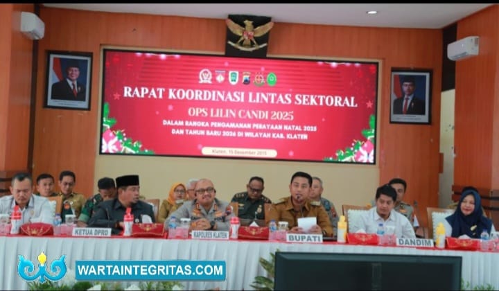 KLATEN, wartaintegritas.com – Polres Klaten menggelar Rapat Koordinasi (Rakor) Lintas Sektoral Operasi Lilin Candi 2025 dalam rangka pengamanan perayaan Natal 2025 dan Tahun Baru 2026 di wilayah Kabupaten Klaten, Senin (15/12/2025). Rakor yang berlangsung di Aula Satya Haprabu Polres Klaten ini melibatkan unsur Forkopimda, instansi teknis,  tokoh lintas agama, serta seluruh Kapolsek jajaran.